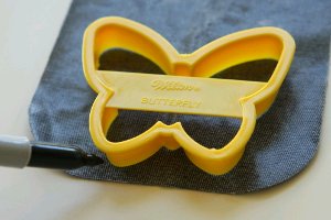 - I traced around the butterfly on the back side of my patch using a Sharpie. This may shock a few of you, but I tried pencil, and a Mark B Gone pen and they just didn’t show up. The Sharpie worked great, I was just careful to cut inside the line of black. You could use a white fabric marking pencil, but I couldn’t find mine. -Do what you can with what you have, I guess.